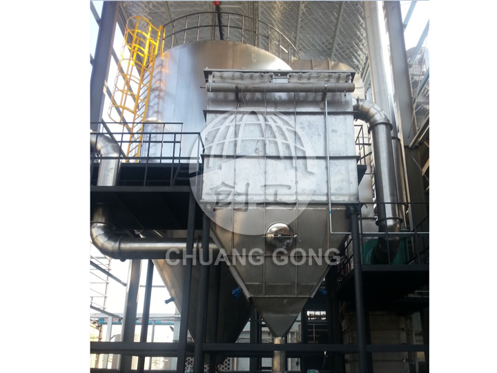 The air is filtered and heated to enter the air distributor at the top of the dryer, and the hot air enters the drying chamber in a spiral shape evenly. The liquid is sprayed into a very fine misty liquid droplet through a high-speed centrifugal atomizer at the top of the tower body, and it can be dried into a finished product in a short time by cocurrent contact with hot air. The finished product is continuously discharged from the bottom of the drying tower and the cyclone, and the exhaust gas is vented by the fan.
