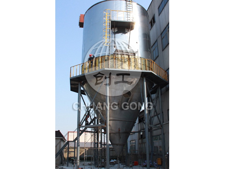 The air is filtered and heated to enter the air distributor at the top of the dryer, and the hot air enters the drying chamber in a spiral shape evenly. The liquid is sprayed into a very fine misty liquid droplet through a high-speed centrifugal atomizer at the top of the tower body, and it can be dried into a finished product in a short time by cocurrent contact with hot air. The finished product is continuously discharged from the bottom of the drying tower and the cyclone, and the exhaust gas is vented by the fan.